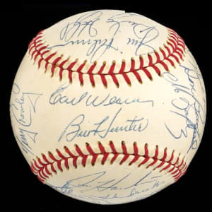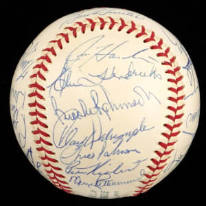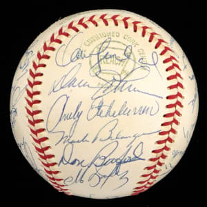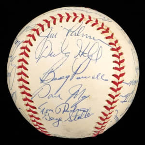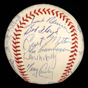 This nice white OAL/Cronin baseball has only one slight scuff near the reverse sweet spot, and (27) members of the 1970 World Champion Baltimore Orioles team have applied signatures, including four Hall of Famers. The signatures are all neat and nicely spaced, averaging (“8 to 10”).