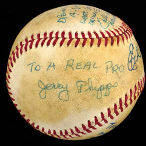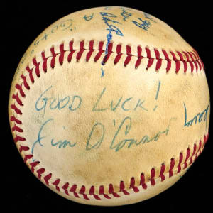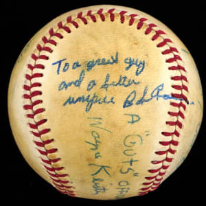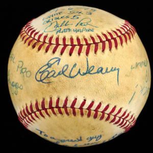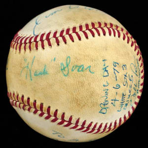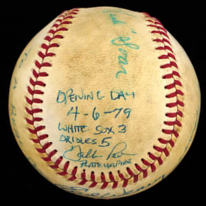 Here's a unique item. Along with Baltimore manager, Earl Weaver (HOF), the umpiring crew from the1979 Baltimore Orioles versus Chicago White Sox Opening Day game At Memorial Stadium have signed this baseball with no stampings, appearing to be signing for one of the umpires. The sweet spot of the toned baseball has a big signature from Earl Weaver. The west panel is signed “To a Real Pro, Jerry Phipps.” The east panel is signed “Good luck! Jim O'Connor.” The north panel is signed “Opening Day 4-6-79 - White Sox 3 - Orioles 5 - Dallas Parks - Plate Umpire.” and “Hank” Soar (ump supervisor). The south panel is signed “To a Great Guy and Better Umpire, Bob Roesner.” The reverse sweet spot is signed “A ‘Guts’ Official, Wayne Keister.” Signatures and inscriptions average (“7 to 9”).