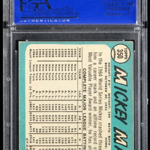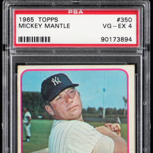 Graded VG-EX 4 by PSA. Swing away for this mid-grade 1965 Topps #350 Mickey Mantle picturing the New York Yankees Hall of Fame slugger taking his hacks against a Spring Training setting.