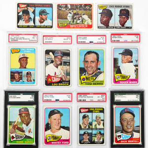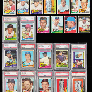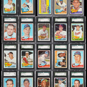 Championship quality 1965 Topps near complete set of 595 (of 598) cards with 45 high-grade PSA/SGC graded with several Hall of Famers and stars. Interestingly, the majority the key cards present better than the commons. Highlights include: SGC MINT 9: #27; SGC NM/MT+ 8.5 (6 cards): With #34, 165, 307, 516, 530, 541; PSA NM-MT 8 (7 cards): With #187 Stengel, #377 Stargell, 405, #470 Berra, 481, #540 Brock, 545; SGC NM/MT 8 (5 cards): With #66, 149, 161, 211, 358; SGC NM+ 7.5: #560 Powell SP; PSA NM 7 (16 cards): With #55 Conigliaro, #155 Maris, #208 John, 259, #260 Drysdale, 275, 280, 281, #282 Murakami RC, #330 Ford, #340 Oliva, 343, #410 Aparicio, 415, #513 Yankees Team, #581 Perez RC; SGC NM 7 (4 cards): With #99 Hodges, #193 Perry, 284, 528; PSA EXMT+ 6.5: #526 Hunter RC; SGC EX/NM+ 6.5: #115; PSA EX-MT 6 (2 cards): With #293, #460 R. Allen; SGC EX/NM 6: #170 Aaron; Ungraded: 550 cards (average EX to EX-MT) with #3 Mantle/Killebrew HR LL (EX), #5 Mantle/Killebrew/Brooks LL (PR, pen mark), #16 Morgan RC (GD), #120 F. Robinson (VG), #130 Kaline (EX), #134 Mantle WS (FR), #150 B. Robinson (EX), #160 Clemente (VG-EX), #205 Spahn (VG-EX), #300 Koufax (GD), #320 Gibson (VG), #385 Yastrzemski (GD), #400 Killebrew (VG), #461 Niekro (EX), #477 Carlton RC (VG), #500 Mathews (EX), #510 Banks (GD), #519 Uecker (EX-MT), #533 McGraw RC (EX-MT), #550 Stottlemyre (EX-MT), #551 Mets Team (NM); Missing only #207 Rose, #250 Mays and #350 Mantle for completion.