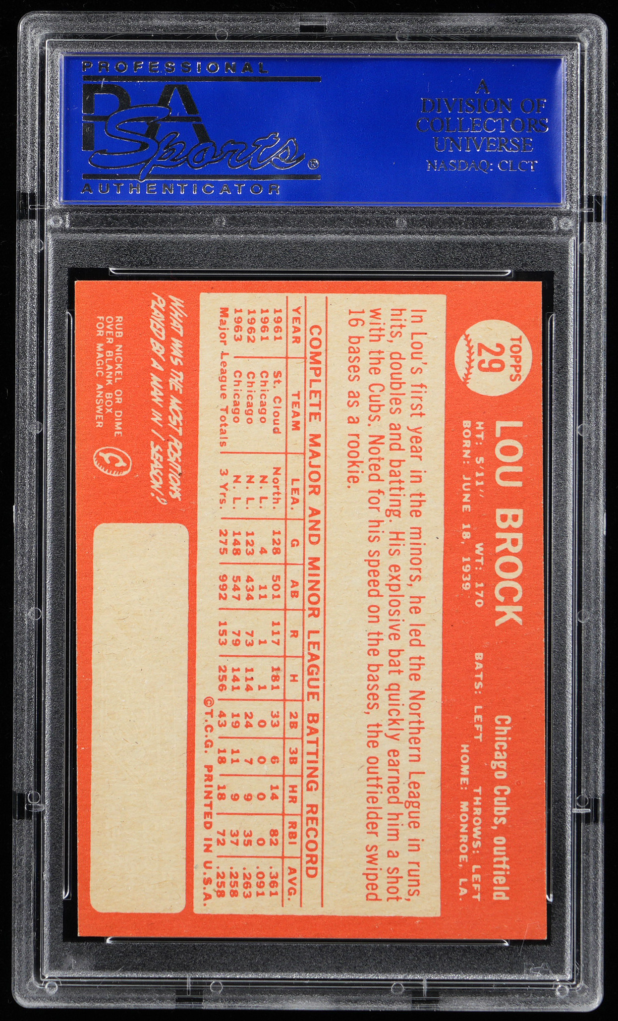 Graded NM-MT 8 by PSA. The final Topps card of Hall of Famer Lou Brock as a Chicago Cub prior to being dealt to the St. Louis Cardinals. A "picture perfect" example that ranks in the upper 13% of all similar copies validated by the authenticator.