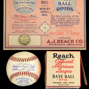 The stampings & presidents date this OAL/Harridge ball to 1942-1945, and it’s in absolutely gorgeous condition. Next to the “William Harridge, Pres.” stamping is a signature stamp “Ralph Daughton – Pres. Piedmont League.” The ball comes with the original Reach baseball box with “Reach Official American League” label stamped with the Ralph Daughton signature. The box is also in beautiful EX-NM to NR-MT condition. The ball also comes with a rare 7x6 Reach Score Card/Advertisement from 1909 in Excellent condition and a one-inch "Official American League Ball - AJ Reach Co." pin from the early 1900s in Excellent condition.