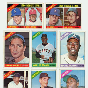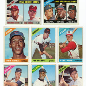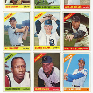 Clean up with the offered 1966 Topps complete set of 598 cards. This popular edition has an approximate condition breakdown of 15% EX or better, 20% VG-EX, 35% VG and 30% GD or lesser with the challenging high series generally presenting on par with the more available numbers. Highlights include: #1 Mays (GD), #30 Rose (FR), #50 Mantle (EX), #70 Yastrzemski (FR), #100 Koufax (VG), #110 Banks (VG), #126 Palmer RC (FR), #160 Ford (FR), #215 N.L. Batting Leaders (GD), #254 Jenkins RC (GD), #288 Sutton RC (GD), #300 Clemente (VG), #310 F. Robinson (VG), #320 Gibson (GD), #365 Maris (GD), #390 B. Robinson (VG-EX), #410 Kaline (GD), #469 Murcer RC (VG), #500 Aaron (GD), #526 Twins Team (GD), #530 Roberts (GD), #535 W. Davis (EX), #540 McLain (VG-EX), #547 H. Clarke RC (GD), #550 McCovey (FR), #565 Piersall (GD), #567 Howser (GD), #580 B. Williams (GD), #583 Tigers Team (PR), #590 Skowron (GD), #591 G. Jackson RC (GD) and #598 Perry SP (VG).