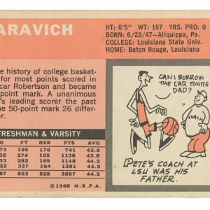 From the looks of it, Maravich granted this signature to a hotel lobby autograph hound, who scored big in his chase of the basketball wizard. This handsome card shows VG-EX+ condition quality, with bold colors, and bright white borders. Applied in customary fashion as “Pistol Pete,” Maravich’s signature presents as a hurried application that’s soft on the first letter on his given name “Pete” but otherwise reasonably attractive. Full LOA from James Spence/JSA.