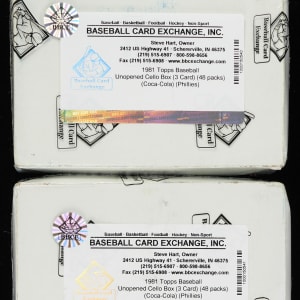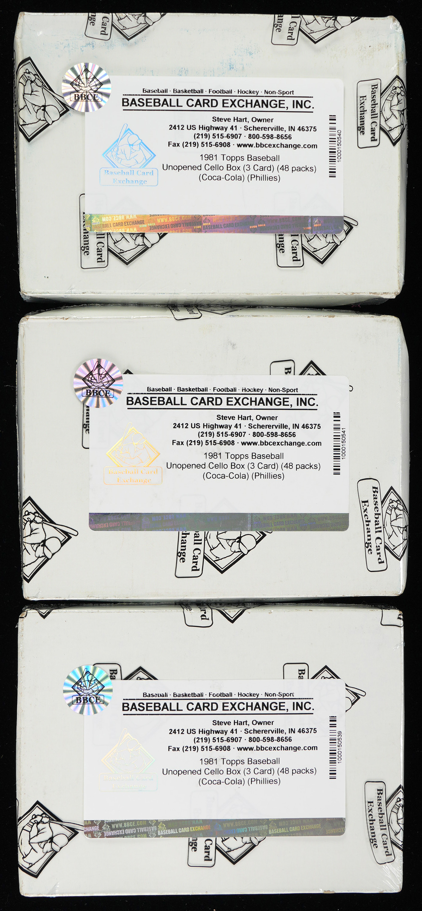 Phantastic trio of 1981 Topps Coca-Cola Philadelphia Phillies unopened cello boxes. Each container will deliver (48) 3-card packs. Piece together numerous high-grade 11-card team sets featuring Hall of Famers Steve Carlton and Mike Schmidt along with all-time hit king Pete Rose! Each box comes shrink-wrapped by Baseball Card Exchange (owned by Steve Hart, the foremost expert on unopened material).