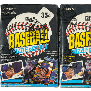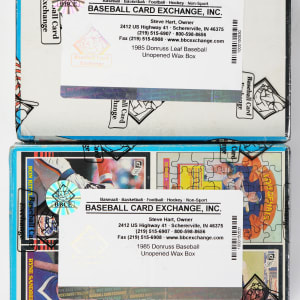 North American Donruss products are found with the offered pair of 1985 Donruss and Leaf unopened wax boxes. Each unsearched container will yield (36) packs with Donruss delivering 15 cards per pack and Leaf 12 cards per pack. Find high-end rookies of Clemens and Puckett that are possible in each product. Each box comes shrink-wrapped by Baseball Card Exchange (owned by Steve Hart, the foremost expert on unopened material).