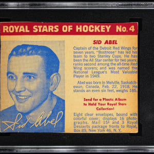 100 Greatest NHL Players! Graded Authentic by SGC due to minimum size requirements not being met. The offered 1952 Royal Desserts Hockey #4 Sid Abel was expertly pared from a period pudding box. This near impossible sample of the Detroit Red Wings Hall of Fame captain is printed in blue text and reveals only a slight upper left corner crease. The total population census for each major grading service is as follows: SGC: 8 and PSA: 5. Part of a 1952 Royal Desserts Hockey near set available separately throughout this auction.