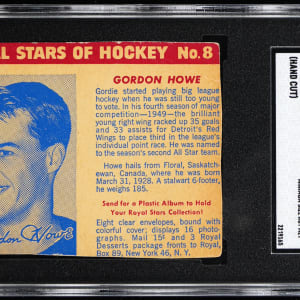 "Mr. Hockey" Variation! Graded Authentic by SGC due to minimum size requirements not being met. In an industry where the term "rare" is often bandied about, the offered 1952 Royal Desserts Hockey #8 Gordie Howe blue tint variant is absolutely the "real deal!" While major grading companies have not distinguished between more common black tint and blue tint variations, Huggins & Scott Auctions has confirmed the existence of three examples of the latter representing the Detroit Red Wings Hall of Fame legend including the offered sample. A monumental regional of arguably the most complete hockey player of all-time, this neatly hand cut example of the "brilliant young right wing" has survived the decades in fine condition. Despite moderate creasing along the upper right and lower left corners, this artifact still showcases outstanding eye appeal. The blank reverse is problem-free. One of only six total Howe copies judged by SGC in any condition! Part of a 1952 Royal Desserts Hockey near set available separately throughout this auction. It is unknown if a blue tint Howe variation has ever been offered for public sale through a major auction house.
