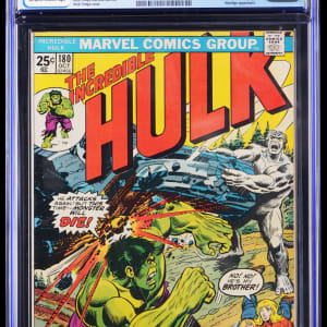 A Wolverine sighting is announced, with this 10/74 Marvel The Incredible Hulk #180 issue. Not the ferocious, furry little beast inhabiting the Michigan peninsula, the even more ferocious Marvel mutant super-hero armed with adamantium claws, a dry wit, and a menacing scowl. This classic Bronze Age comic book boasts the first brief appearance of the Wolverine/Logan character, who shows up in a cameo on the last page. CGC has just returned this prized comic with a grade of (5.0, Off-White to White Pages). In light of Wolverine's tremendous popularity, and numerous media appearances, this semi-key issue is a solid blue chip buy for the long haul. Label notes are "Len Wein story, Herb Trimpe and Jack Abel art, Herb Trimpe cover. 1st appearance of Wolverine in cameo on last page. Wendigo appearance.".