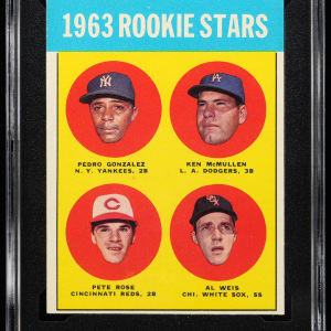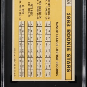 A Prime Value Pick! Graded EX 5 by SGC. The offered 1963 Topps #537 Pete Rose rookie card dazzles by exhibiting blistering surface colors against a radiant multi-colored "floating head" setting. This crucial 1960s sports card is crease-free and displays only modest perimeter wear. The "Minor League Lifetime Records" reverse is clean.