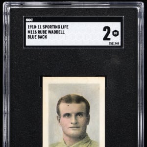 Graded GOOD 2 by SGC. The ill-fated George (Rube) Waddell, Hall of Fame pitcher for the St. Louis Browns. Blue back variation. Part of a larger 1910-1911 M116 Sporting Life near set break available throughout this auction.