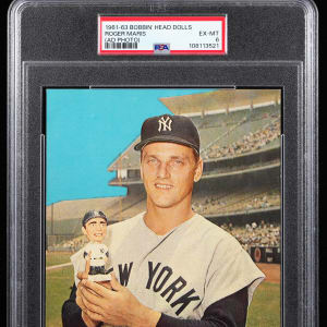 Graded EX-MT 6 by PSA. Only 29 total copies of the offered 1961-1963 Bobbin' Head Dolls Roger Maris ad photograph have been judged by the authenticator. With no reported sales in over five years, this glossy full-color 5x7 advertising photo of the New York Yankees slugger will be of significant bidding interest. The home run champ steadies a personal bobble head while casting an approving smile against a cavernous ballpark setting. With exception to mild corner touches, this oversized promo displays unchipped edges, vibrant surface accents and a creamy blank back. For the Bronx oddball specialist who thought they had it all!