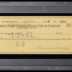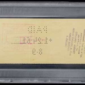 The 8 ¼ inch long check (EX-MT) is drawn on the People's First National Bank and Trust Company, Pittsburgh, PA, and dated January 13th, 1961, and has been made out to “The Brilliant Market and is endorsed by Hall of Famer Branch Rickey (“7-8”). It has been encapsulated by PSA/DNA and Certified Authentic.