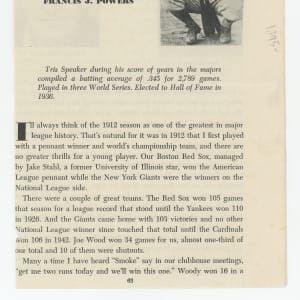 The postcard is accompanied by three pages cut from a magazine with the story of Tris Speaker’s 1912 World Series battle against the New York Giants when he played for Boston, as told to the author by Speaker himself. The article details the World Series, including Tris’ single off of Christy Mathewson that helped Boston win the series. He ranks this as his greatest moment as a player, comparable to his greatest moment as a manager when he managed the 1920 Cleveland Indians to the championship. The three-page article also has a picture of Speaker as well as Christy Matthewson, John McGraw and Rube Marquard, as well as the box score from the game. Excellent with staple.