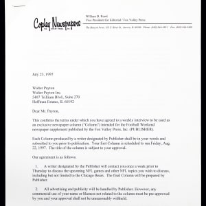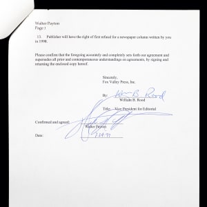 Addressed to Walter Payton, Hoffman Estates, this three-page contract dated July 23rd, 1997, with Copley Newspapers was an agreement for a weekly interview with the Hall of Famer to be used exclusively in their “Football Weekend” newspaper supplement. Widely regarded as one of the greatest football players of all time, Payton, who’s signatures are usually hard to read, has signed this contract with an unusually large ballpoint signature (“9”).
