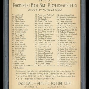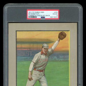 Graded VG-EX 4 by PSA. Extremely attractive 1911 T3 Turkey Red Cabinets #103 Ed Konetchy checklist back. This St. Louis Cardinals first baseman is crease-free and amplified by a stirring tri-color stadium backdrop. A tip-top choice for those pursuing the challenging oversized designation.