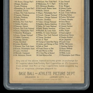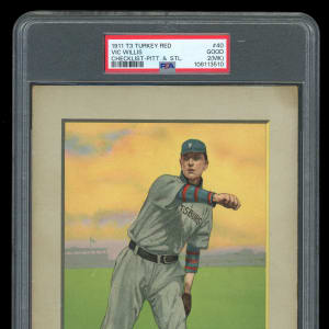 Graded GOOD 2 by PSA with an (mk) qualifier due to a faint reverse pencil mark. 1995 Hall of Famer Vic Willis is listed a member of both the Pittsburgh Pirates and St. Louis Cardinals on the offered 1911 T3 Turkey Red Cabinets #40 checklist back. With exception to an inch-long lower left edge crease tracing through the pitcher's right shin, this premium is otherwise absent of any serious condition factors. A century-old treasure that showcases dazzling surface accents against a pastoral ballpark setting.