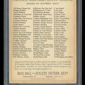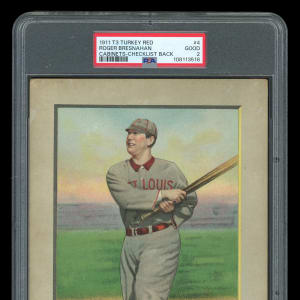 Graded GOOD 2 by PSA. The royal "Duke of Tralee" follows through on the offered 1911 T3 Turkey Red Cabinets #4 Roger Bresnahan premium. This St. Louis Cardinals Hall of Famer is crease-free with moderate, but not severe corner wear. The engaging action pose is bolstered by intricate player/uniform detailing set against a glorious pastel splashed ballpark backdrop. The (checklist back-offer) reverse is problem-free.