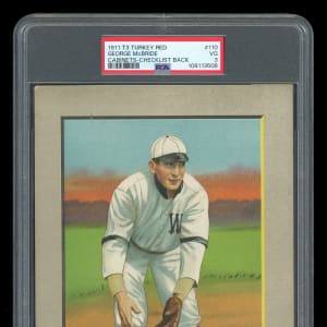 Graded VG 3 by PSA. Presented is a 1911 T3 Turkey Red Cabinets #110 George McBride checklist back. Washington Senators shortstop.