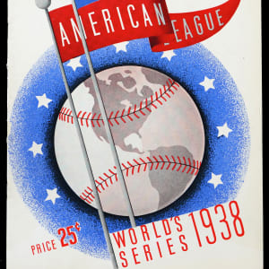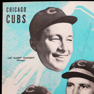 This 1938 World Series program, Chicago at New York, is in Excellent condition. The middle scorecard section is unscored. The program features 4 pages of composite photos with “floating heads” of the Chicago Cubs and 4 pages of the New York Yankees. The inside front cover has a photo of Leo “Gabby” Hartnett and it is signed beside the photo, “Gabby” Hartnett (“8-9”). Other Cubs pictured include Dizzy Dean, Tony Lazzeri, Stan Hack and Billy Herman. Yankees photos include manager Joseph McCarthy, Tom Henrich, Joe DiMaggio, Frank Crosetti and “The Iron Man,” Lou Gehrig.