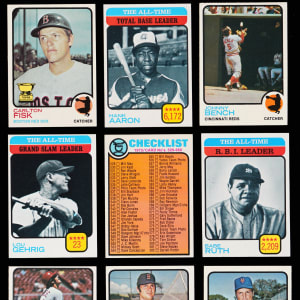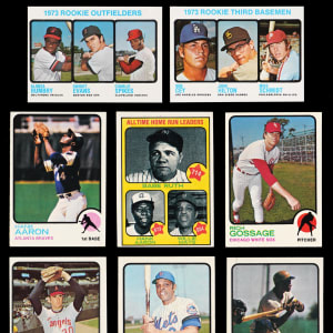 Formidable 1973 Topps complete set of 660 cards. This razor-sharp assembly generally averages NM condition with several better and a smaller percentage lesser. Several fine candidates for third-party professional grading are tucked within! Highlights include: #1 Ruth/Aaron/Mays (EX), #50 Clemente (EX), #100 Aaron (EX), #130 Rose (EX), #174 Gossage RC (NM), #193 Fisk (NM), #220 Ryan (EX-MT), #245 Yastrzemski (EX-MT), #255 R. Jackson (EX), #305 Mays (EX-MT), #350 Seaver (EX-MT), #380 Bench (EX), #472 Gehrig LDR (EX), #473 Aaron LDR (NM), #474 Ruth LDR (EX-MT), #588 CL (NM), #613 Boone RC (EX-MT), #614 Bumbry/Evans RC (EX-MT) and #615 Schmidt RC (EX-MT).