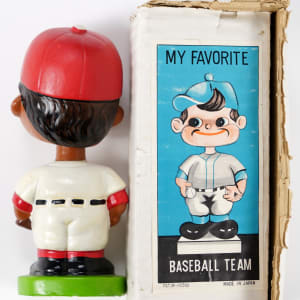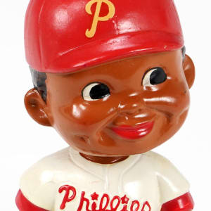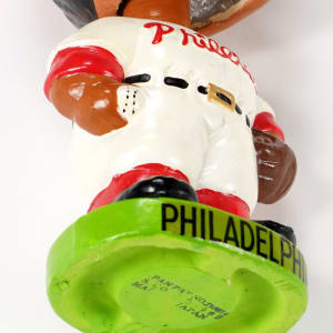 Level up your figure collection with the addition of this rare 1962 Philadelphia Phillies black face bobble head doll. As with the other team examples, the Phillies figure from the 1963-1965 black face baseball bobble head series can be found with a happy expression or a serious expression. Here we have a happy version example, with vibrant colors and a bright white uniform. The raised red lettering on the jersey shows no wear. The colors are strong, and the glaze gloss is generally excellent, though the finish on the cap is uneven. The decal on the front of the base is bold and full, and remarkably, the head opening shows minimal wear. Factory quality control missed a beat with the off-center placement of the hat decal. Otherwise, this rare piece reports in exceptional NM+ condition. The factory stamp on the underside is partial, but there's plenty of detail to identify it as "Japan Pat. No. 218614 S.S. Corp. © 1962 Made In Japan."