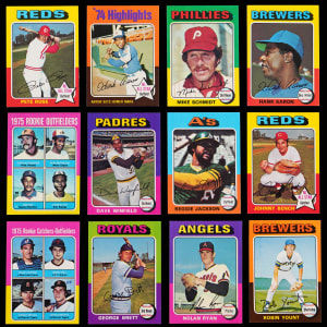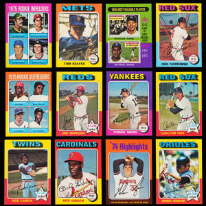Sterling 1975 Topps complete set of 660 cards. This upper tier assembly is consistently attractive, averaging NM quality throughout, with several better and a smaller percentage lesser due to factory errant common to the issue. Several viable candidates for third-party professional grading are dispersed throughout! Keys include: #1 Aaron HL (NM-MT), #5 Ryan HL (EX-MT), #61 Winfield (EX-MT), #70 Schmidt (EX-MT), #223 Yount RC (trimmed), #228 Brett RC (NM), #260 Bench (NM), #300 R. Jackson (NM), #320 Rose (NM), #500 Ryan (NM), #616 Rice RC (NM), #620 Carter RC (NM-MT) and #660 Aaron (EX-MT).