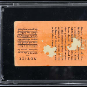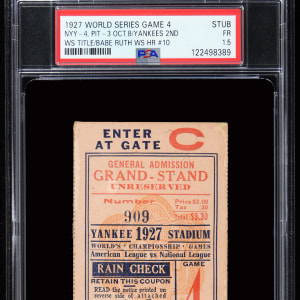 One of the greatest teams in baseball history put the crowning touch on a truly memorable season the day this 1927 World Series Game 4 ticket stub was issued. Played at Yankee Stadium on October 8, 1927, this game saw the Yankees complete a sweep of the Pittsburgh Pirates, to earn the second of their record 27 World Series championships. Legendary slugger Babe Ruth hit the 10th World Series home run of his career in this game, which ended with Earle Combs scoring on a wild pitch in the bottom of the ninth inning. This is the only time a World Series ended on a wild pitch, and it’s ironic that a lineup known as “Murderer’s Row” won in such fashion. PSA had graded this high profile stub FR 1.5.