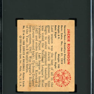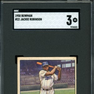 Graded VG 3 by SGC. Second-year 1950 Bowman #22 Jackie Robinson low number. This attractive full-body illustration of #42 is crease-free and displays moderate, but not severe corner wear. Off-white edges frame the Brooklyn Dodgers Hall of Famer's colorful batting pose. The biographical reverse displays only a trace of wax staining. A perfectly acceptable foundational example for those seeking to build the turn-of-the-decade edition.