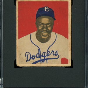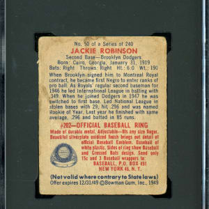 Graded POOR 1 by SGC. Bragging rights are assured for the victor of the offered 1949 Bowman #50 Jackie Robinson rookie card. Despite a combination of surface creasing consistent with its overall judgment, the smiling Brooklyn Dodgers Hall of Fame subject still presents quite well. The gray reverse displays moderate staining but is otherwise problem-free.