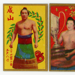 The ancient sport of Japanese Sumo wrestling is represented with this obscure pair of 1954 H541 Renga 7-8-9 menkos. These thick cardboard slabs are bolstered by ornate period graphics and slick gilt bordering. Includes: 1.) Naruyama (EX-MT, Maegashira) and 2.) Tochinishiki (EX-MT, Ozeki).