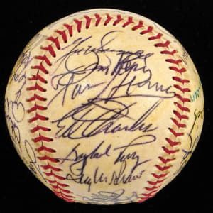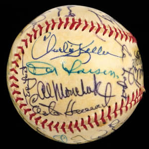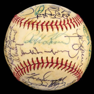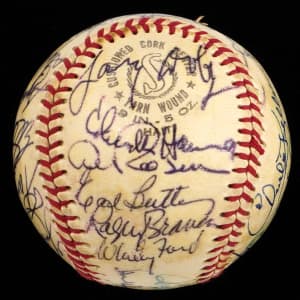 There's very little blank space on this multi-signed Spalding Official League baseball, because it's covered with bold signatures, applied at a 1970 Baseball Writers Association Dinner. A total of (27) autographs, including (7) Hall of Famers, have been protected by a coating of shellac, and most remain as firm as they day they were signed, fifty-five years ago.
