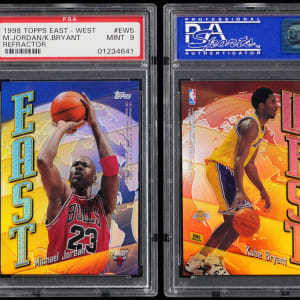 Graded MINT 9 by PSA. Two of the greatest and most game-changing figures in NBA history are teamed up on this stunning 1998 Topps Basketball East - West #EW5 Michael Jordan/Kobe Bryant refractor. With over 66,000 career points and 11 rings between them, the gleaming quality of this scarce modern insert matches the fireworks of MJ's and "The Black Mamba's" Hall of Fame game. With millions of Jordan and Bryant fans worldwide, only 370 copies of this shiny variant have been judged by the authenticator. With 1990s basketball inserts in perpetual demand, there is still plenty of upside potential for this collecting centerpiece!