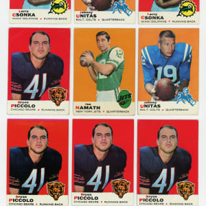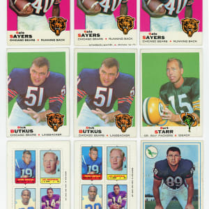 1969 Topps: (339 cards, average EX to EX-MT, with 193/263 partial) with (4) #20 Dawson (average EX), (2) #25 Unitas (EX-MT, EX), (4) #26 Piccolo RC (average VG), (3) #51 Sayers (EX, (2) VG), (4) #55 Nitschke (average VG-EX), (4) #75 Meredith (average EX), #100 Namath (GD), (2) #120 Csonka RC (both EX-MT), (2) #139 Butkus (EX, VG), #215 Starr (VG);