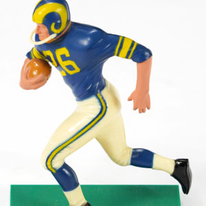 Make a determined dash to the bidding end zone, for this 1959-1963 Hartland Plastics John Arnett Los Angeles Rams football running back statue. Decorated on the front of the base with a gold facsimile signature, this dashing fellow cuts a very handsome figure. The pants have toned to a cream shade, a little of the luster is off, and a few minor wear spots are detected under magnified scrutiny. However, to the naked eye this vintage shelf-sized icon is highly appealing, with bold paint, decent gloss, and full jersey numbers, making it worthy of an (EX+) rating.