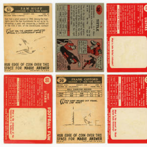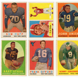 Core group of six 1957-1959 Topps Football Hall of Famers including a rookie cards. Includes: 1957 Topps: #30 Tittle (NM); 1958 Topps: (3 cards) with #22 Unitas (GD), #66 Starr (VG), #90 Jurgensen RC (GD); 1959 Topps: (2 cards) with #20 Gifford (EX) and #51 Huff RC (GD).
