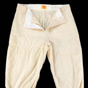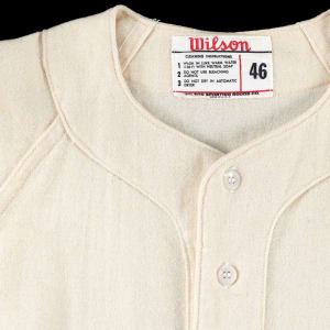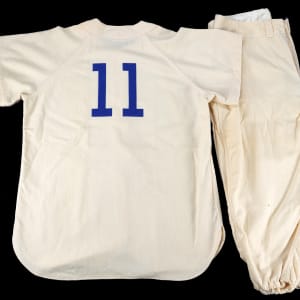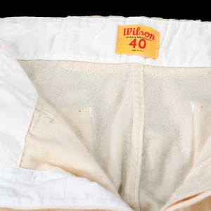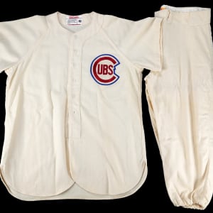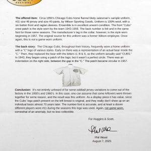 Inject some old-time style into your collection, with this 1950s salesman's sample Chicago Cubs home uniform set. This unworn flannel uniform is comprised with a jersey and pants, presenting in exceptionally fine condition. Located inside the collar, is a Wilson Sporting Goods Co. size "46" factory label, with laundry instructions for the care of this 100% wool garment. A large red and blue Cubs logo patch on the left breast is consistent with the style worn by Cubs players from 1943-1956, while the label inside the collar is cited as being of a type first used in 1957. Seen on the back are blue felt number "11" patches. Also made of 100% wool, the pants are unadorned, save for a Wilson Sports Equipment size "40" factory label inside the waistband. Clean inside and out, this vintage uniform is blessed with tremendous display appeal.