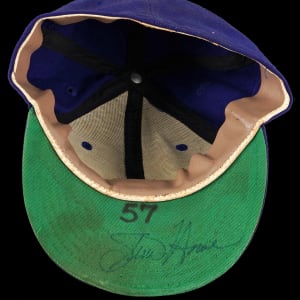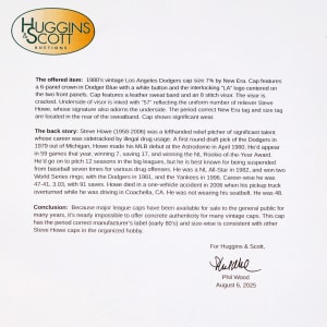 Talented relief pitcher Steve Howe put out plenty of fires on the baseball diamond, but he just couldn’t quench his thirst for substance abuse, which resulted in seven suspensions during his twelve year MLB career. From Howe’s first MLB team, comes this signed Los Angeles Dodgers cap. Labeling on the interior sweatband identifies the size as “7-3/8”, and the maker as “New Era”. Howe’s uniform number “57” is written boldly on the underside of the cracked brim, which is soiled and stained on both sides. Also seen on the underside of the brim is a somewhat faded, yet clearly recognizable Howe signature. The Dodgers logo is located at the customary position on the crown, which also shows considerable soiling and staining. Abundant signs of authentic use/wear are evident, and the hat retains a decent shape, well-suited for display. Howe died at the age of 48, in 2006, when he rolled his truck while driving in Coachella.