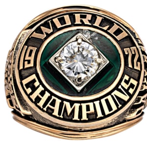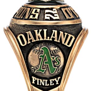 Offered here is a World Series “Size 9” extra ring personally ordered by Finley for his first championship conquest. At its center gleams a large round cubic zirconia stone, set against a vibrant Kelly green backdrop with a minor chip at the twelve o’clock position. Encircling this focal point is the proud inscription “1972 World Champions.” The left shank features “Finley” etched below the classic A’s logo, while the right shank celebrates the series victory with “World Series A’s 4 – Reds 3,” followed by Finley’s engraved signature and the team’s motivational mantra “S+S=S” – symbolizing “sweat plus sacrifice equals success.”