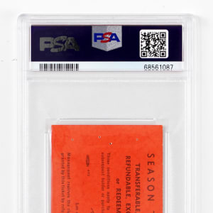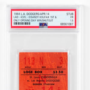 Surprisingly, Sandy Koufax made just a single opening day start, during his 12-year career with the Brooklyn/Los Angeles Dodgers. With that in mind, we’re not going very far out on a limb, in calling this 1964 Los Angeles Dodgers opening day ticket stub a great find. This game took place at Dodgers Stadium on 4/14/64, with the Dodgers facing the St. Louis Cardinals. Koufax started the first, last and only season opener of his career that day, and went the full nine innings, striking out five, and walking none, while scattering six hits, to earn a 4-0 complete game, shutout win. On offense, big Frank Howard went 2/4, with a 2-run homer. PSA has encapsulated this prize stub, with a grade of (FR 1.5), making it “1 of 1” at this level, with just 1 rated higher.