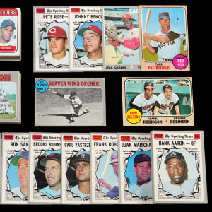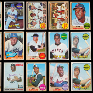 1968 Topps: (44 cards, average GD) with #45 Seaver (FR), #50 Mays (PR), #110 Aaron (GD), #150 Clemente (GD), #250 Yastrzemski (FR), #280 Mantle (VG), #330 Maris (VG), #480 Manager’s Dream/Clemente (VG), #490 Super Stars Mantle/Mays (VG-EX), #500 F. Robinson (GD), #530 Bird Belters/The Robinsons (VG);