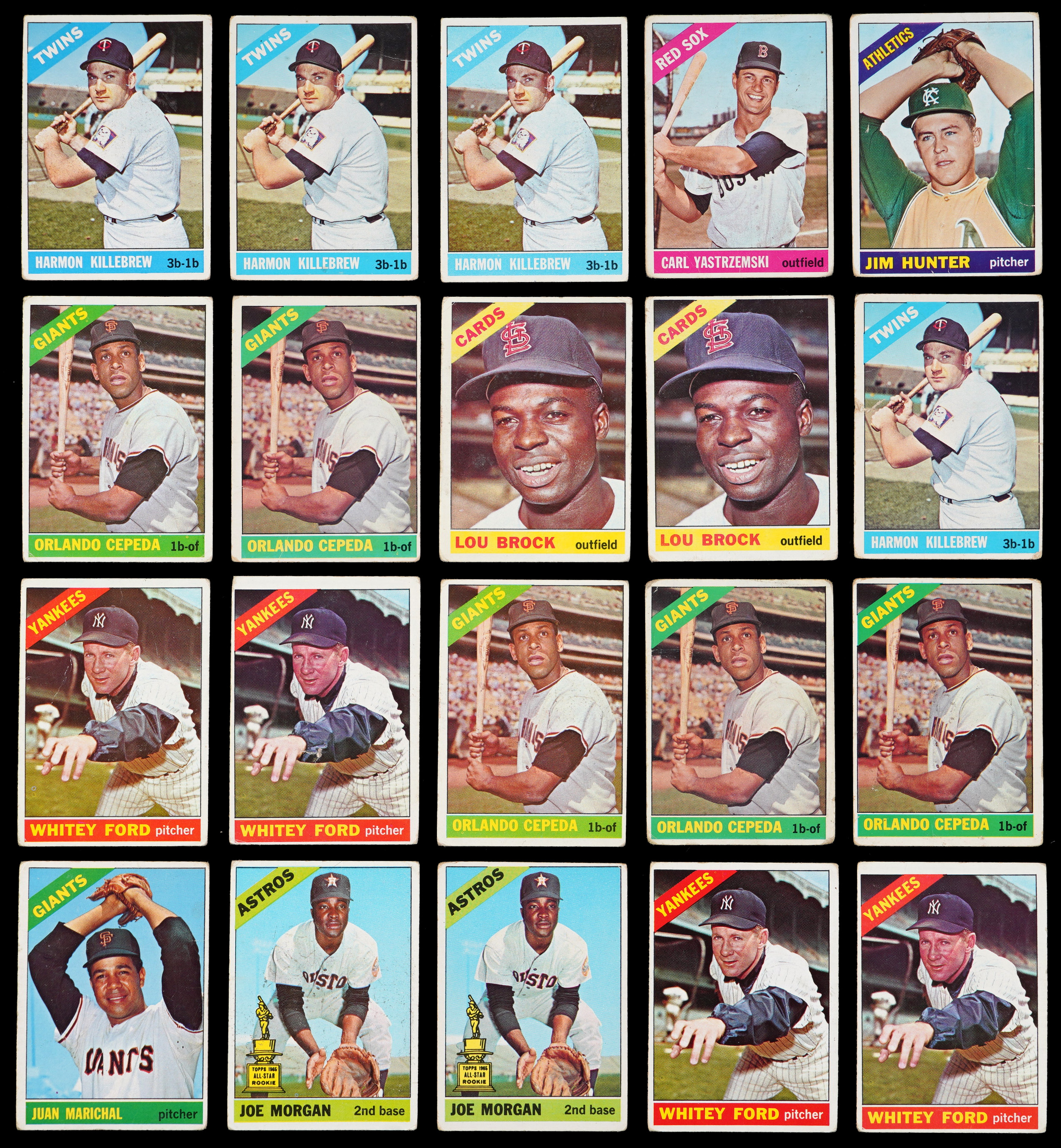 Large 1966 Topps collection of (775+) cards with (60+) Hall of Famers including “The Mick!” Despite being low-grade with the majority averaging (FR) condition, the sheer star power overwhelms any technical issues. No high numbers are present. Highlights include: #30 Rose (PR), #36 Hunter (FR), #50 Mantle (FR), #70 Yastrzemski (FR), #103 Groat (PR, reverse writing, No Trade Statement), (5) #120 Killebrew (average FR), (2) #125 Brock (both GD), (2) #126 Palmer RC (both FR), (5) #132 Cepeda (average FR), (4) #160 Ford (average FR), (2) #195 Morgan (GD, FR), #215 Clemente/Aaron/Mays (FR), (2) #254 Jenkins RC (both FR), (2) #288 Sutton RC (both GD), #300 Clemente (FR), #310 F. Robinson (FR), #320 Gibson (FR) and (2) #420 Marichal (GD, FR).
