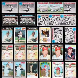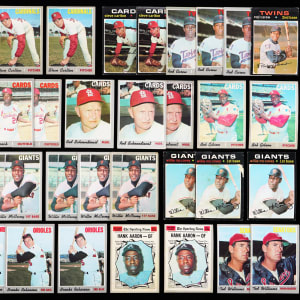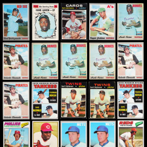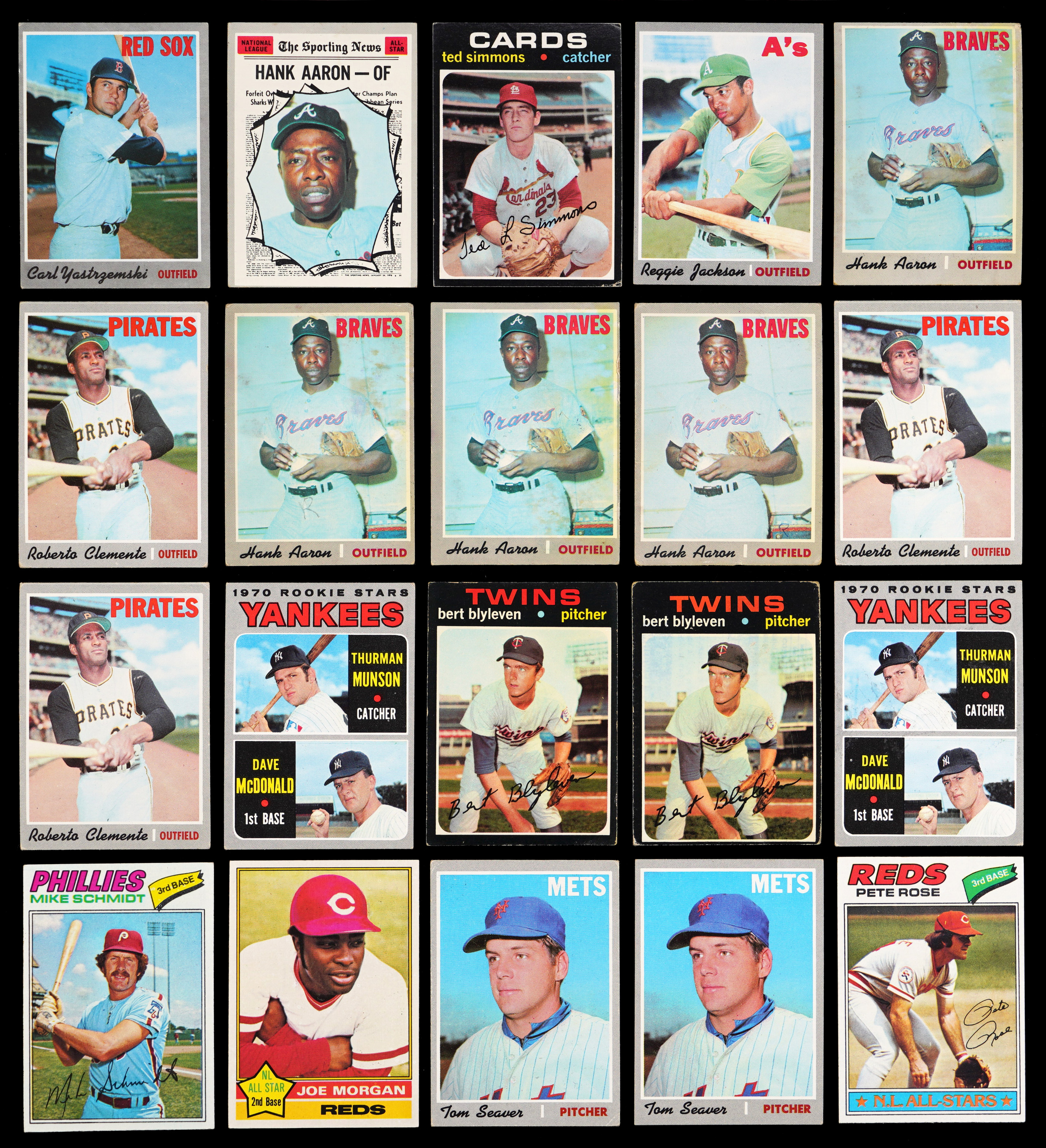 1970 Topps: (1,450+ cards, average VG to VG-EX, includes 63 high numbers) with (2) #1 Mets Team (both VG), (3) #10 Yastrzemski (VG-EX, (2) VG), #140 R. Jackson (GD), (2) #189 Munson RC (both VG), (3) #195 Seaver Playoffs (VG-EX, VG, FR), #197 Ryan Playoffs (VG), (4) #198 Mets Celebrate/Ryan (average VG), (3) #211 T. Williams (VG-EX, VG, GD), (3) #220 Carlton (VG-EX, VG, GD), (4) #230 B. Robinson (average GD), (5) #250 McCovey (average GD), (3) #290 Carew (VG-EX, (2) FR), (2) #300 Seaver (VG-EX, GD), (7) #330 Brock (average GD), (10) #346 Schoendienst (average VG), (3) #350 Clemente ((2) GD, one PR, reverse writing), #458 Rose AS (GD), (3) #462 Aaron AS (VG, GD, FR), (4) #500 Aaron (average FR), (2) #530 Gibson (GD, PR);