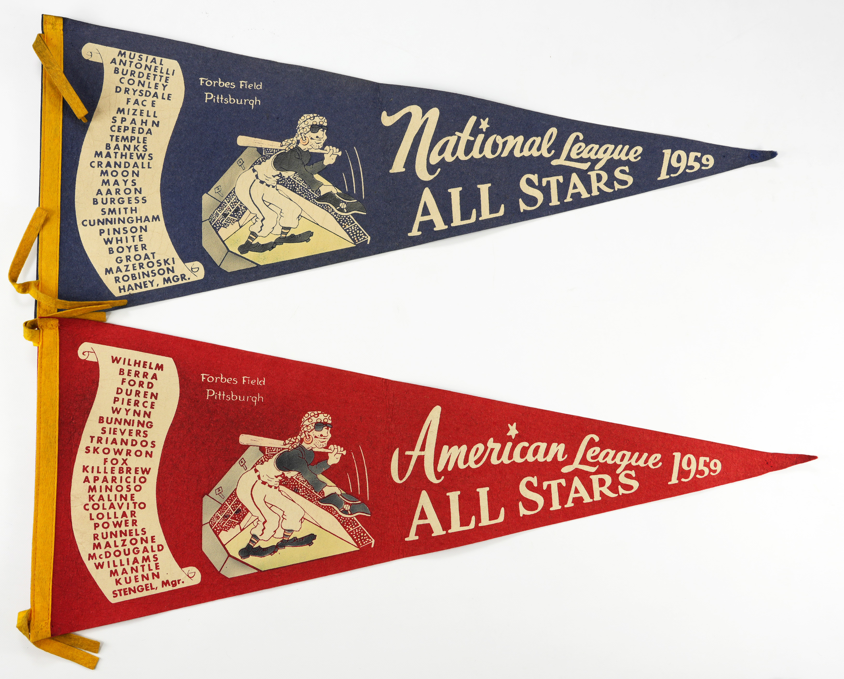 1959 A.L. and N.L. All-Stars pennant set with both featuring the Pirate in Forbes Field with a scroll of team rosters on the left including Williams and Mantle for the A.L. and Musial and Aaron for the N.L. Both have a heavy fold in the center. (Both VG).