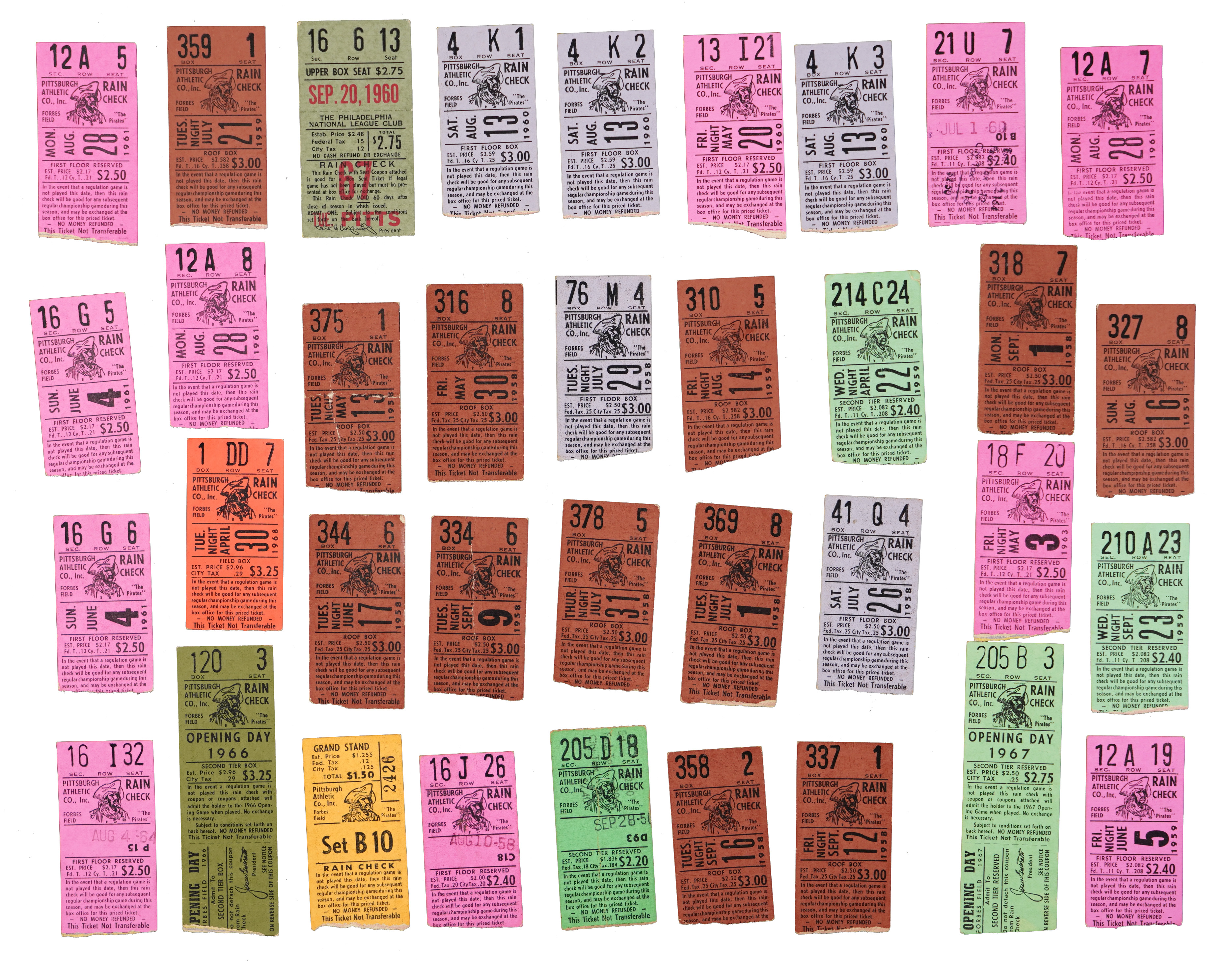 1950s Pirates Stubs: (21 stubs) with Opening Day 1958, 5/13/58, 5/30/58, 6/17/58, 7/1/58, 7/26/58, 7/29/58, 7/31/58, 8/10/58, 9/1/58, 9/9/58, 9/12/58, 9/16/58, 4/22/59, 6/5/59, 7/21/59, 8/14/59, 8/16/59, 9/23/59, 1959 All-Star Game, one undated;