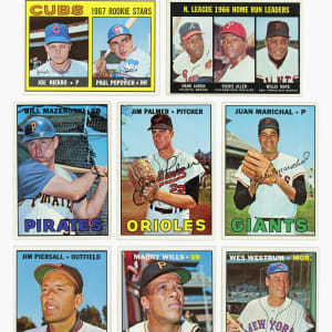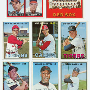 1967 Topps partial: 450/609 cards, average VG, includes 69 high numbers averaging EX, with #60 Aparicio (VG), #236 Koufax/Marichal/Gibson/Perry LL (GD), #244 Aaron/R. Allen/Mays LL (VG), #337 Morgan (EX), #361 Clemente CL (VG), #369 Hunter (VG-EX), #417 Bruce ERR (VG-EX), #445 Sutton (VG-EX), #460 Killebrew (EX-MT), #475 Palmer (VG-EX), #480 McCovey (VG-EX), #500 Marichal (EX), #510 Mazeroski (VG-EX), #536 J. Niekro RC (VG-EX), #540 Cash ( EX-MT), #558 Belanger RC (EX), #570 Wills (EX), #580 Colavito (EX), #584 Piersall (EX), #593 Westrum (VG-EX), #604 Red Sox Team (VG), #605 Shannon (EX), #607 Stanley (VG-EX);