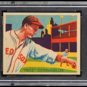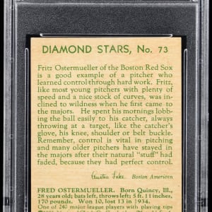 Graded NM-MT 8 by PSA. Boston Red Sox pitcher Fritz Ostermueller who coined the phrase "Home run hitters drive Cadillacs; singles hitters drive Fords." Ranks in the upper 20% of all similar copies evaluated by the grading service with 5 higher. Part of a 1934-1936 Diamond Stars PSA graded near set break available throughout this auction.