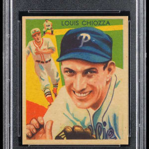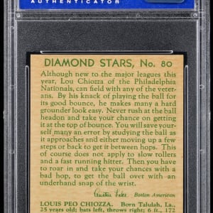 Graded NM-MT 8 by PSA. Philadelphia Phillies player Lou Chiozza. Ranks in the upper 19% of all similar copies evaluated by the grading service with 3 higher. Part of a 1934-1936 Diamond Stars PSA graded near set break available throughout this auction.