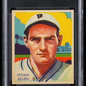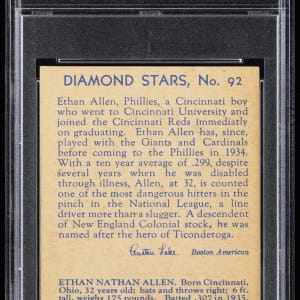 Graded NM-MT 8 by PSA. Philadelphia Phillies outfielder Ethan Allen. Tougher high number. Ranks in the upper 10% of all similar copies evaluated by the grading service with 3 higher. Part of a 1934-1936 Diamond Stars PSA graded near set break available throughout this auction.
