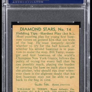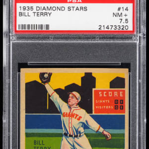 Graded NM+ 7.5 by PSA. New York Giants Hall of Famer Bill Terry. Ranks in the upper 8% of all similar copies evaluated by the grading company. Part of a 1934-1936 Diamond Stars PSA graded near set break available throughout this auction.